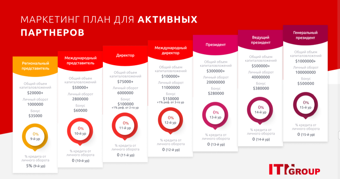 Уникальный маркетинг план, позволяющий получать доход с 1 по 8 линию! Также активные партнеры, переходя в каждый новый ранг, будут получать бонусы и подарки