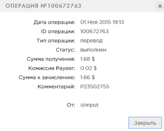 17:36 01.11.15 Receive 107718205 Received Payment 1.5 USD from account U9509843. Memo: API Payment. Payment ID: 581111