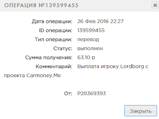 Комментарий: Выплата игроку Riafbiz с проекта Carmoney.Me