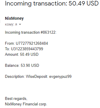 24.12.20 05:58 Received Payment 50.1 USD from account U13249477 to account U77ХХХХХ.