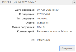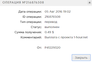 The amount of 3.56 USD has been deposited to your Perfect Money account. Accounts: U12112343->U6399089. Memo: API Payment. Выплата с проекта 1-hour.net.. Date: 10:11 08.08.16. Batch: 142482438.