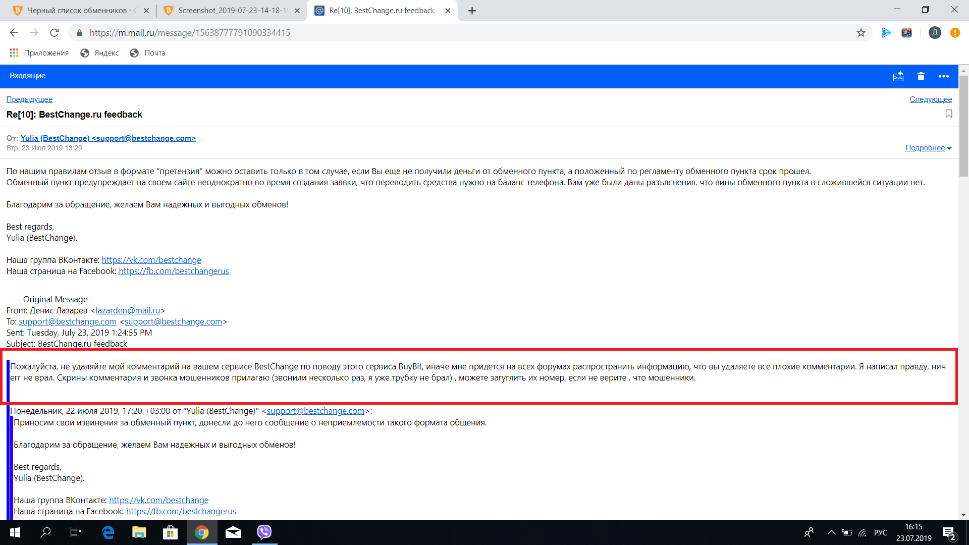 Доброго всем времени суток! Утверждает бестчейндж что это ресурс информационный, где расположены только надежные обменники, так вот 14.02 я на бестчейндж нахожу обменник Cryptopay24, направление обмена биток на монеро в количестве 0.2625btc, на тот момент по курсу 11000$, отправил средства с блокчейна(подскажите куда заливать скрины, все скрины переводов есть!) через не большой промежуток времени, статус заявки изменили на приостановлено, стали требовать мои данные, мол я согласился с правилами обменник, правила личные обменник, это не закон и вы не являетесь оператором персональных данных, вы не имеете права требовать данные клиента! На что мне отвечают мол данные давай и дальше не будем разговаривать, т о есть фактически я получил или получаю бабки с теневого ресурса, как они говорят, язе обязан перед ними отчитываться, но выходит данный обменник, судя еще по отзывам за этот обменник на бестчейндже, они так делают со всеми клиентами и глядят прокатит нет... а бестчейндж сразу сняли претензию, а позавчера и отзыв удалили, что бы видимо клиенты не отпугивались... удаление отзыва это ли не пособничество конкретное этой аферистской схеме??? На каком основании они присваивают пусть и грязные деньги и на каком основании бестчейндж их прикрывает??? Скрины все есть на переводы и на заказ в данном обменное! Подскажите на какой ресурс залить скрины?