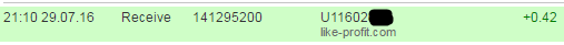 Выплата процентов и маленько рефки инстант: 08.01.16 12:21 Account Receive +2.65 Received Payment 2.65 USD from account U11602604 to account U87*****. Batch: 141768568. Memo: API Payment. Invoice 1549, maxsus. + 0.35