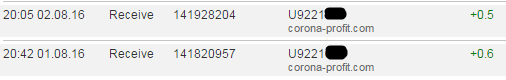 02.08.16 06:50 Receive Received Payment 0.5 USD from account U9221680 to account U11727***. Batch: 141853948. Memo: API Payment. corona-profit.com