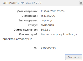 Comment: Выплата игроку ludacris11 с проекта Carmoney.Me