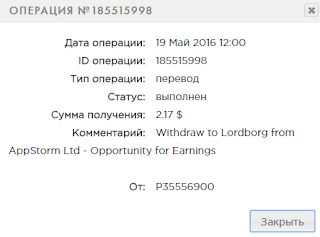 05.20.16 19:54 Account Receive +4.4 Received Payment 4.4 USD from account U10855399 to account U... Batch: 134078429. Memo: API Payment. Withdraw to Alex1805f from AppStorm Ltd - Opportunity for Earnings.