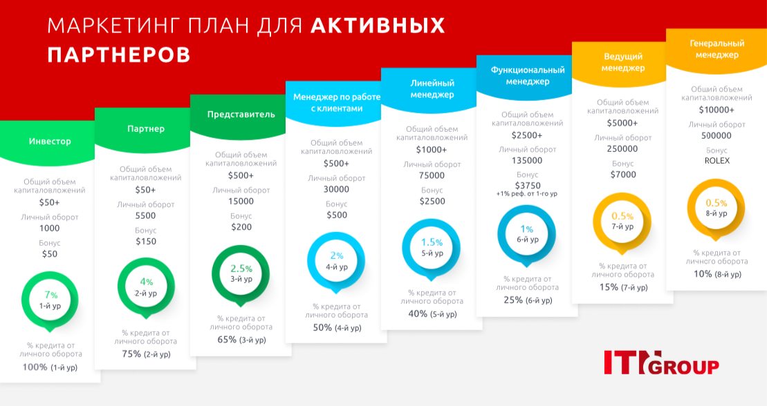 Уникальный маркетинг план, позволяющий получать доход с 1 по 8 линию! Также активные партнеры, переходя в каждый новый ранг, будут получать бонусы и подарки