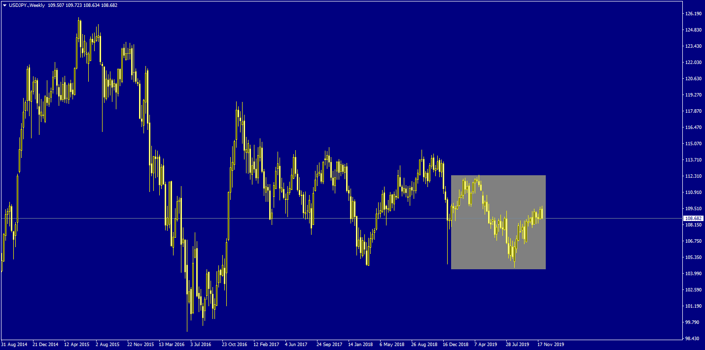 Итак, у нас доллар иена, хочу посмотреть, что за год случилось с этой парой и чего от нее ждать в будущем году. Для начала, стоит обратить внимание, что несмотря на довольно высокую волотильность инструмента, сейчас цена находится, приблизительно, на тех уровнях, на которых год и начинался. Это говорит нам о том, что цена, вероятней всего, находится в некотором диапазоне и следует поискать его. Это нам поможет понять, что ждать дальше от цены.