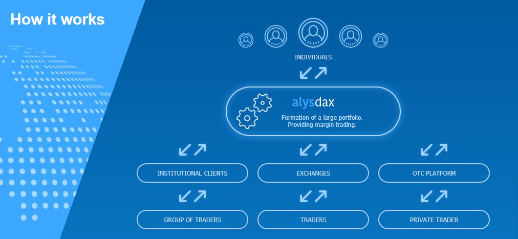 Проект направлен на создание финансового пула со стороны инвесторов (физических лиц) и предоставление рычагов для партнеров-трейдеров (юридических лиц, малых и крупных платформ). AlysDax использует маржинальные инструменты для транзакций на мировых платформах по торговле крипто-активами.
