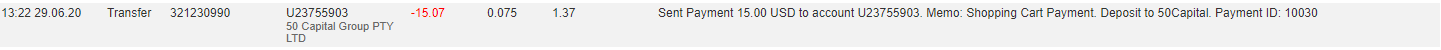The amount of 200 USD has been withdrawn from your account. Accounts: U3669097->U23755903. Memo: Shopping Cart Payment. Deposit to 50Capital.. Date: 12:15 29.06.20. Batch: 321221828.