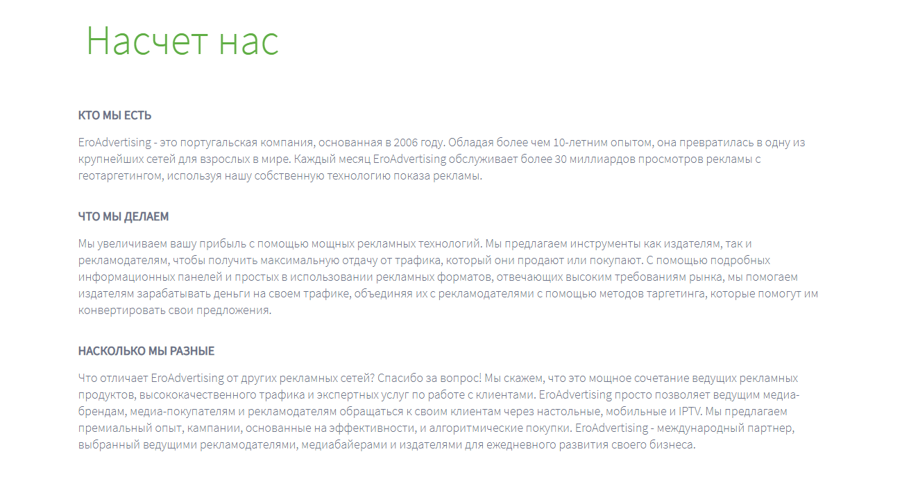 Европейская сеть eroadvertising.com на рынке с 2006 года, продает и покупает. Продает и покупает трафик для взрослых. Обслуживает 30 миллиардов показов рекламы в месяц. Сеть предлагает эффективные инструменты как рекламодателям, так и издателям, чтобы увеличить их прибыль.